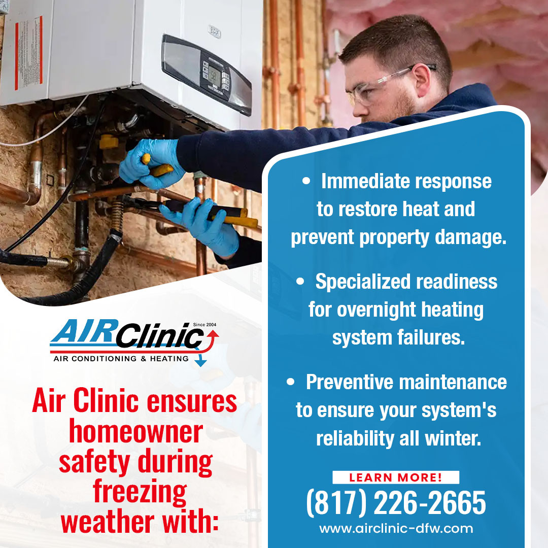 Grand Prairie, TX- As winter cold snaps continue to affect North Texas, Air Clinic is emphasizing the importance of uninterrupted heating repair services when residential systems fail during freezing conditions. Delayed heating restoration has been linked to frozen plumbing, moisture damage, and indoor safety concerns, making response time a key factor for homeowners during extreme weather.